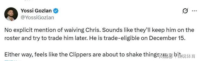 薪金专家戈兹兰解析指出,快船的官方声明中并未出现“裁掉”相关表述,更倾向于暂时将其留在阵容中,后续将重点推进交易运作,“这显然是快船阵容重构的信号,他们正酝酿更大规模的变动”。